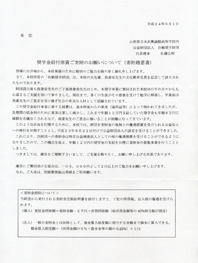 これにより、当財団への寄付金は特定公益増進法人としての税の優遇措置を受けることができるようになりましたので、この機会を捉え、年額12万円の奨学金の支給を目標に寄付金の募集事業を行うこととしました。