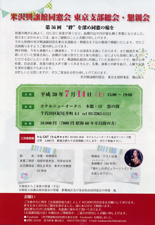 米沢興譲館同窓会 東京支部総会・懇親会の御案内 (2018年6月20日)