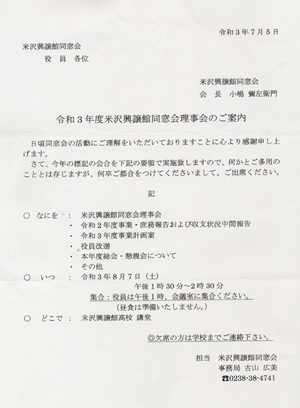 令和3年度米沢興譲館同窓会理事会のご案内 (2021年7月11日)